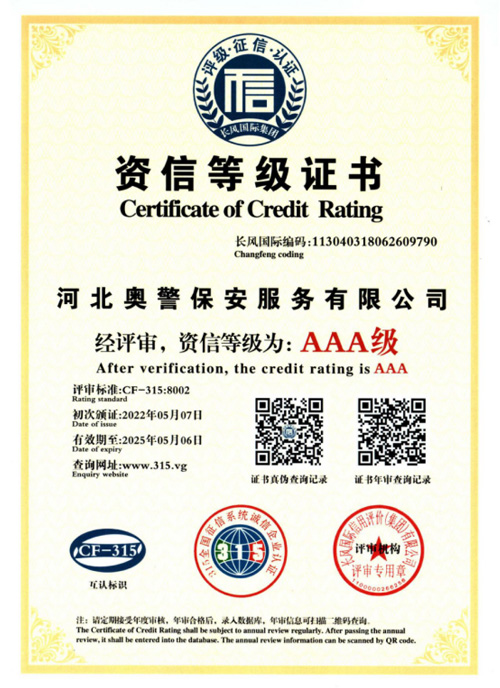 “忠誠的伙伴,非凡的朋友”,河北奧警保安服務(wù)有限公司本著“客戶的需求就是我們的追求”的服務(wù)理念,與廣大客戶攜手并進、共創(chuàng)恢弘偉業(yè)。